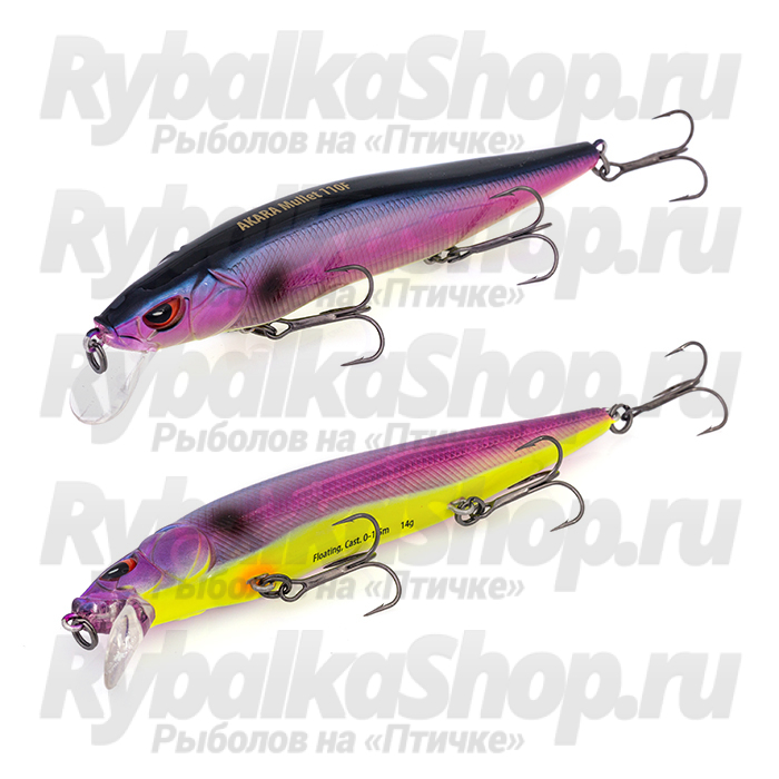 Akara Mullet 110F - плавающий воблер класса миноу для ловли твичингом. Лучшей аннимацией являются резкие рывки с короткими паузами. Отлично показал себя при ловле щуки на небольших глубинах, а так же судака на мелководье в вечернее время. Акустический. Кастинг 0 до 1,5 м.