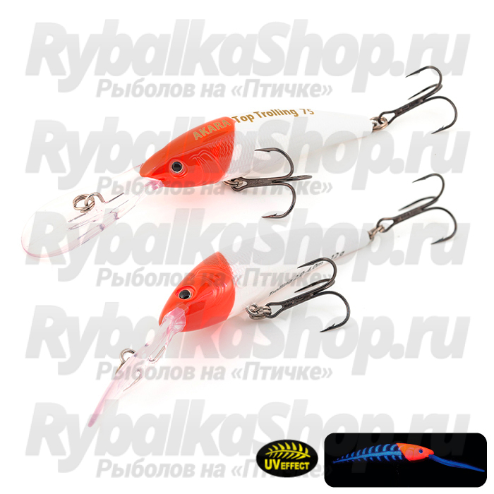 Воблер Akara Top Trolling - плавающая модель, выпускается в трех размерах 75, 90 и 110 мм. Игра воблера зависит от скорости проводки. При медленной игре воблер переваливается с боку на бок, данная проводка провоцирует осторожного хищника на поклевку. При быстрой проводке воблер показывает активную размашистую игру с высокой частотой и средней амплитудой колебаний, такая проводка привлекает активного хищница. Плавающий. Акустический. Заглубление 75 мм - 4,5 м, 90 мм - 6 м, 110 мм - 7,5м.