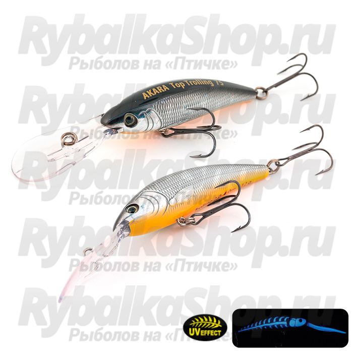 Воблер Akara Top Trolling - плавающая модель, выпускается в трех размерах 75, 90 и 110 мм. Игра воблера зависит от скорости проводки. При медленной игре воблер переваливается с боку на бок, данная проводка провоцирует осторожного хищника на поклевку. При быстрой проводке воблер показывает активную размашистую игру с высокой частотой и средней амплитудой колебаний, такая проводка привлекает активного хищница. Плавающий. Акустический. Заглубление 75 мм - 4,5 м, 90 мм - 6 м, 110 мм - 7,5м.