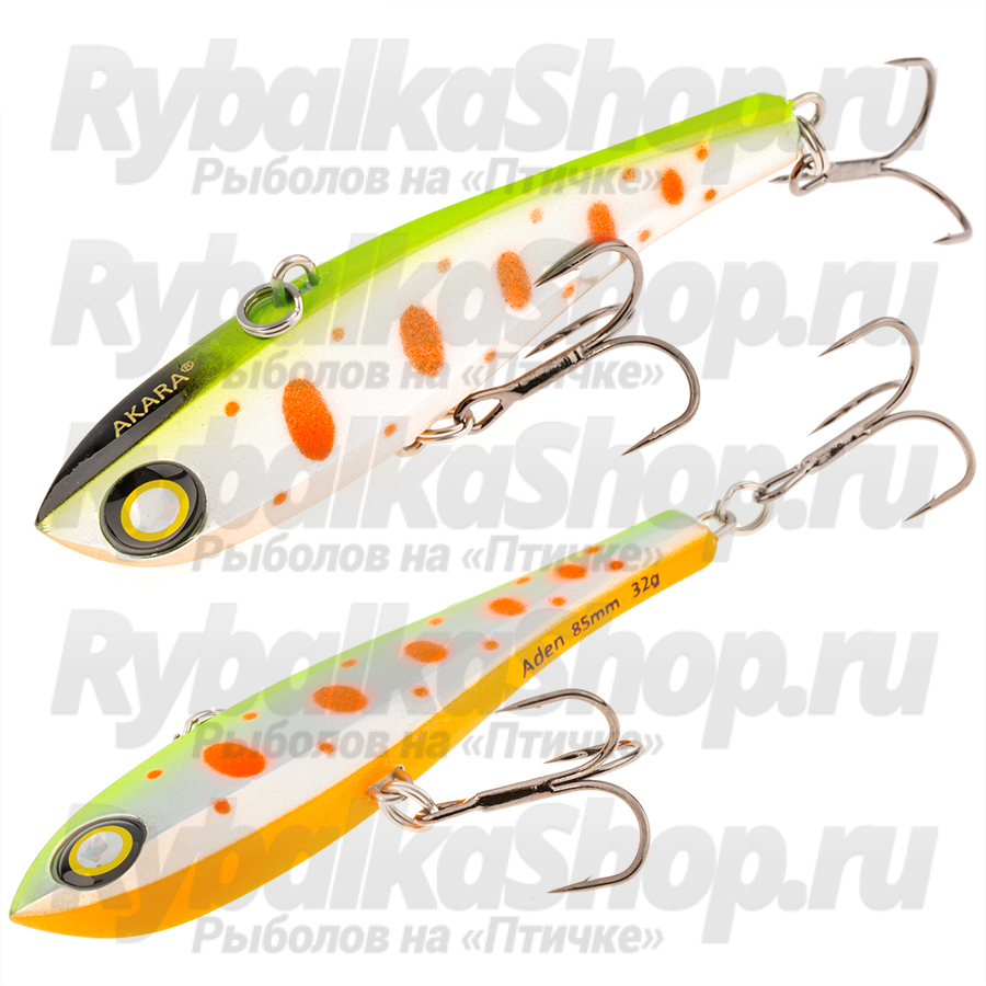Раттлин Akara ADEN выпускается в трех размерах: 52 мм и вес 10 грамм, 68 мм и 16 грамм, 85 мм и 32 грамма. Приманка отлично подходит для ловли, как зимой, так и летом. Отличительной особенностью при ловле в отвес, является планирующая игра на боку. То есть, после потяжки, Aden заваливается на бок и в таком положении опускается. При ловле в заброс обладает высокочастотными колебаниями способными привлечь хищника с дальних расстояний. Раттлин Akara ADEN способен ловить любую хищную рыбу, имеющуюся в водоеме. Особенно хорошо ловит судака. А в 68 размере, подойдет и для ловли прудовой форели. Оригинальное голографическое покрытие, дает дополнительное преимущество и несомненно привлекает рыбу.
