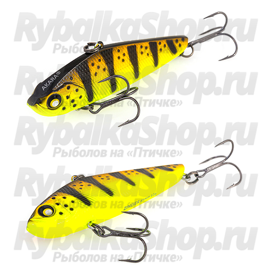 Akara ZINGER имеет классическую форму и превосходную игру, он хорош тем, что практически моментально заводится и не требует специальных навыков при проводке. Воблер универсальный и одинаково успешно работает в любой сезон, на различных глубинах, на вертикальных подбросках и при горизонтальной проводке. Akara Zinger выпускается в двух размерах 60 и 65 мм, весом 9 и 12 грамм. Тонущий. Акустический.