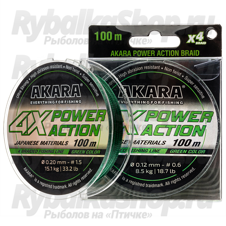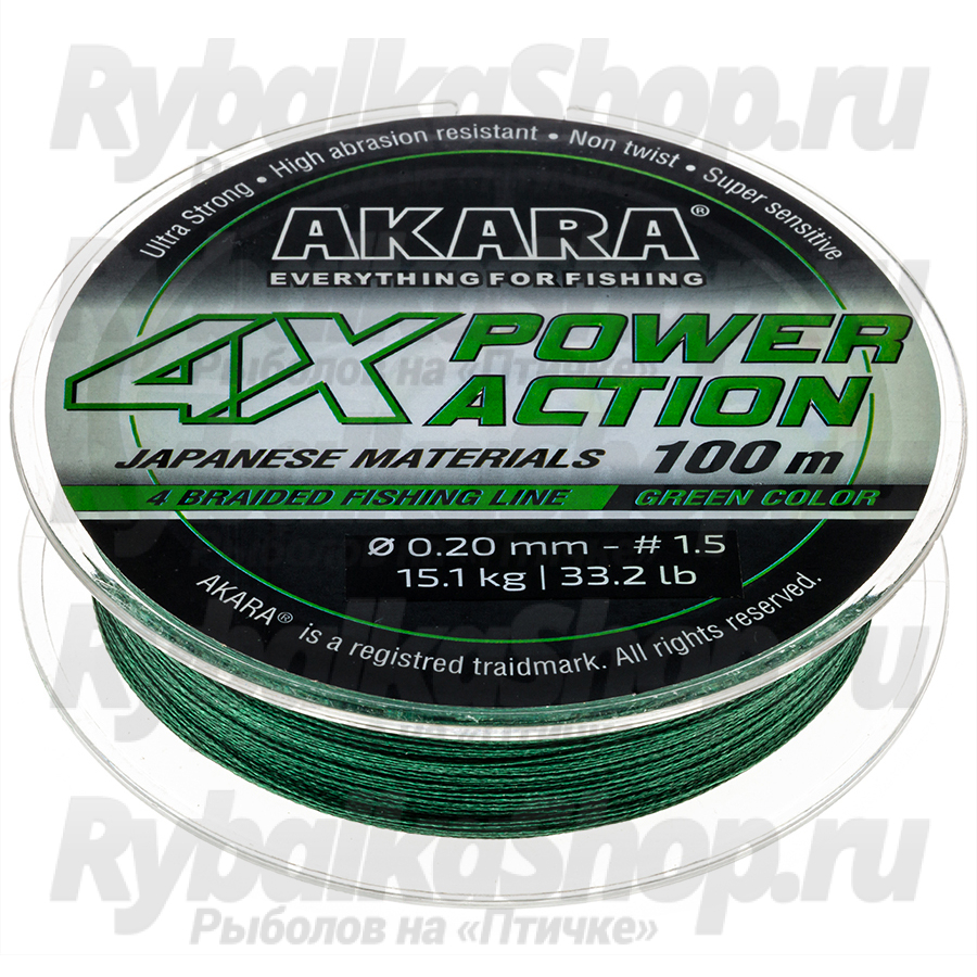 Шнур Akara Power Action X-4 Green 100 – универсальный четырехжильный рыболовный шнур, изготовлен из качественного современного волокна японского производства, имеет высокую плотность плетения и не боится морской воды. Шнур отличается высокой прочностью и надежностью, имеет круглую форму, абразивоустойчив и подойдет для любой рыбалки. Шнур имеет тёмно-зелёный окрас, что делает весьма незаметным. При обзоре характеристик и тестов, шнур Akara Power Action X-4 Green 100 получил положительные отзывы и рейтинги экспертов по рыбной ловли. Шнур имеет круглую форму и поставляется в намотках 100 метров.