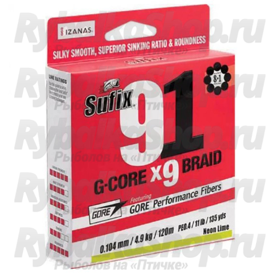 Плетёная леска Sufix 91 G-Core продолжает линейку плетеных лесок Sufix со сверхнадежными характеристиками при забросе и борьбе с рыбой. С устойчивым к истиранию волокном GORE® Performance в сердцевине и 8 сплетенными волокнами UHMPE вокруг. Таким образом, конструкция 91 G-Core с 9 волокнами обеспечивает низкое растяжение, прочность на узлах и превосходную стойкость к истиранию. Сверх гладкое покрытие 91 G-Core обеспечивает дальний заброс и превосходный коэффициент погружения.