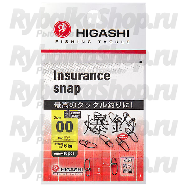 Название модели карабина Insurance в переводе означает "страховка". В названии производитель подчёркивает надёжность карабина. Простая классическая форма Higashi Insurance Snap гарантирует подвижность оснастки и крепкое соединение. Формируя размерную линейку этой серии, производитель старался учесть потребности широкого круга рыболовов.