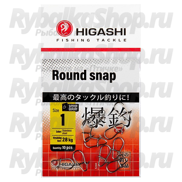 Higashi Round Snap – это застежка, которая относится к типу «американка». Изготовлена из тонкой проволоки и обладает округлым и длинным поддевом, который без труда проходит в любые труднодоступные колечки приманок. Отлично сочетается со всеми видами спиннинговых приманок, не сковывая их движений.
