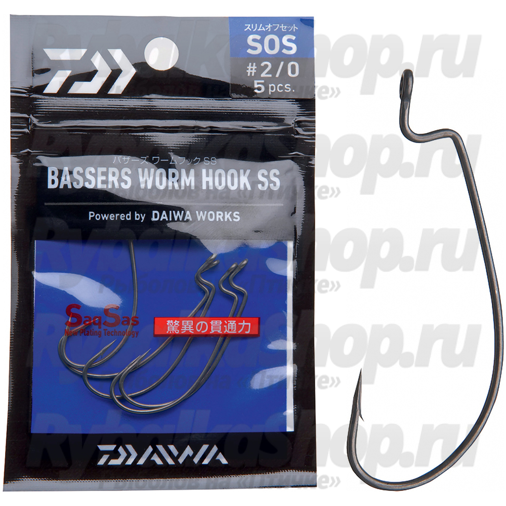 - Особенная острота крючка была достигнута, благодаря ультрасовременной технологии SaqSas, делающей конус жала совершенным. Чтобы крючок Daiwa офсетный Basser's Worm Hook SS SOS долго не тупился, его защищает фторидное финишное покрытие. Есть экспертное заключение подтверждающее, что SaqSas повышает эффективность подсечки крючков на 40 %.