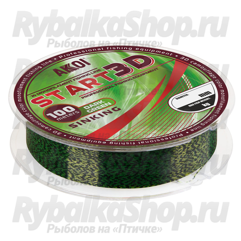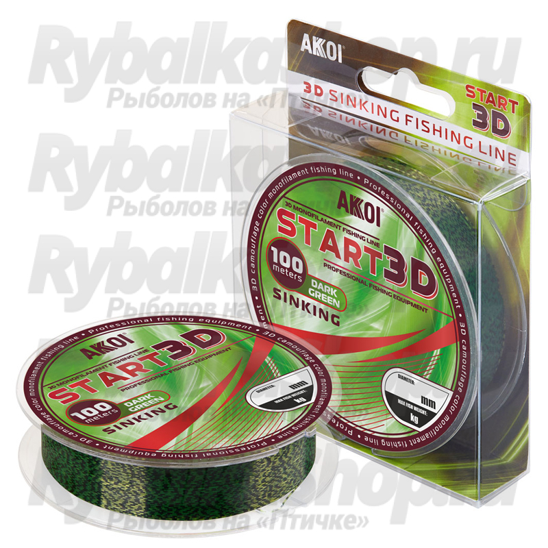 Леска Akkoi Start 3d 100m Dark-Green Мнофильная леска START 3D от компании AKKOI — это новая разработка компании, объединившая в себе наиболее успешные решения, используемые при производстве. Результатом этого являются превосходные характеристики лески: высокая прочность и достаточная эластичность, а спецаильная технология 3D окрашивания придает леске отличные камуфлирующие свойства.