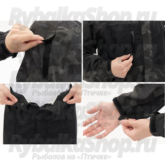 Мембрана отлично справляется с функцией защиты и паро-влагоотведения: кожа остается сухой, сохраняется комфортный микроклимат. Дополнительно предусмотрена система вентиляции, в том числе, и в районе капюшона. Брюки пошиты из трехслойной мембраны RainMax, что способствует увеличению прочности. Имеется возможность отрегулировать посадку на талии, а также низ брюк (при помощи липучек).