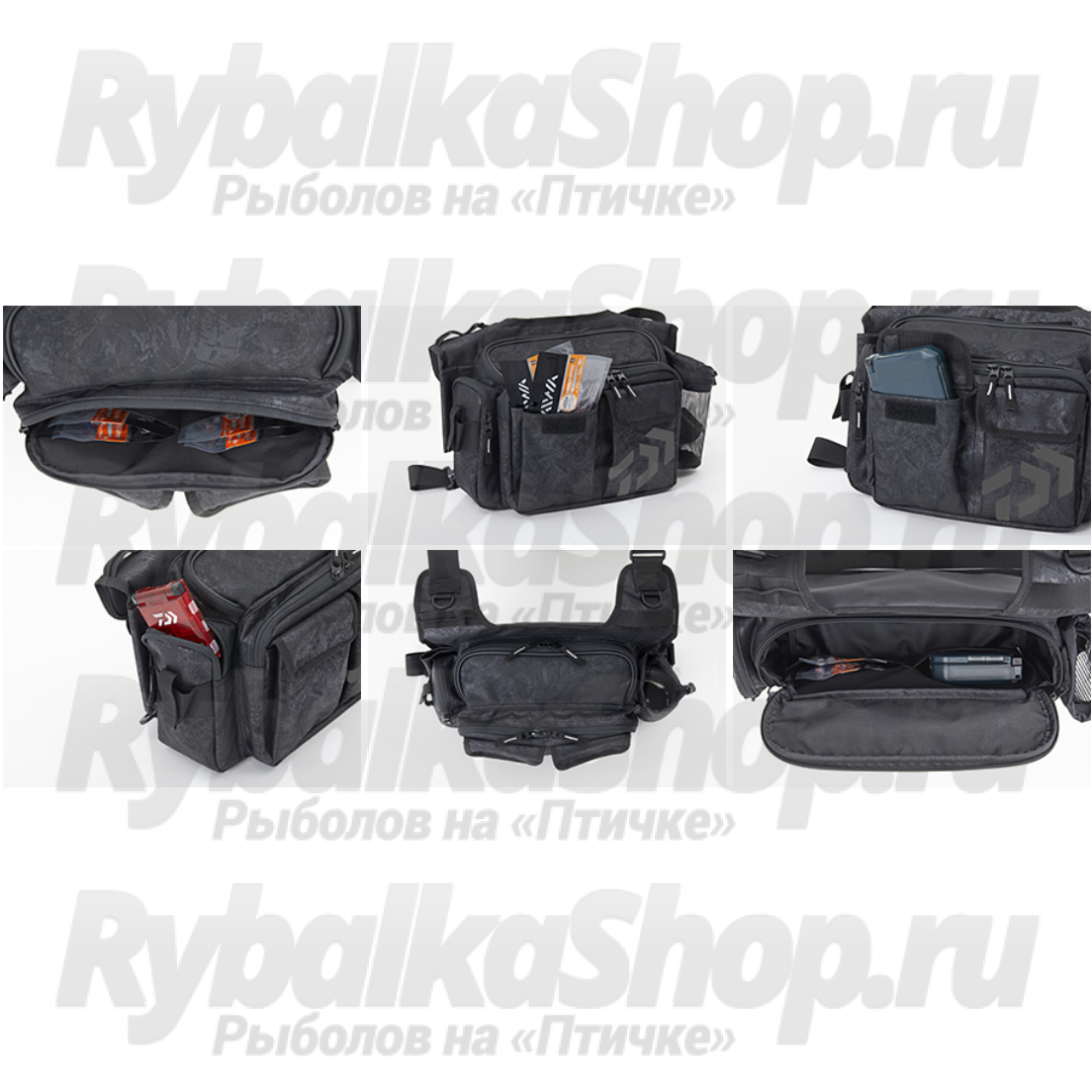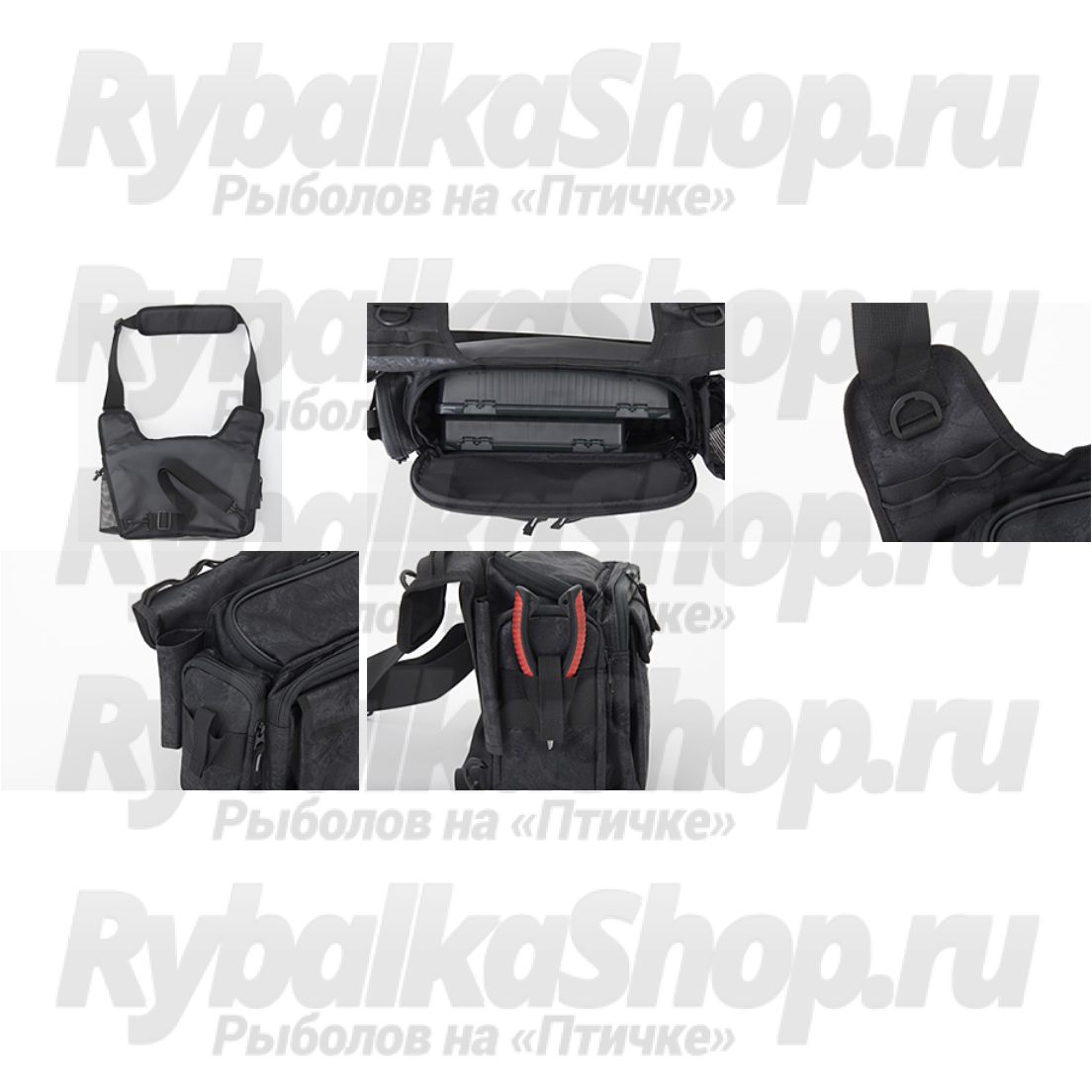 Сумка через плечо, которая обеспечивает удобную посадку по фигуре, необходимую для различных сцен рыбалки. Большое отверстие с кантом для легкого открывания и закрывания. В главном помещении можно хранить несколько коробок среднего размера (примерно 26 х 19 см). С передним карманом и боковыми карманами для раздельного хранения мелких предметов. Устройство с петлей на поясе, к которому можно прикрепить сумки и одежду. С держателем для плоскогубцев и кольцом D. Держатель для ПЭТ-бутылок с использованием полимерной сетки, которая затрудняет попадание игл. Плечевой ремень с подкладкой, уменьшающей нагрузку на плечо. С поясным вспомогательным ремнем для уменьшения соскальзывания сумки. С простым держателем для удилища.