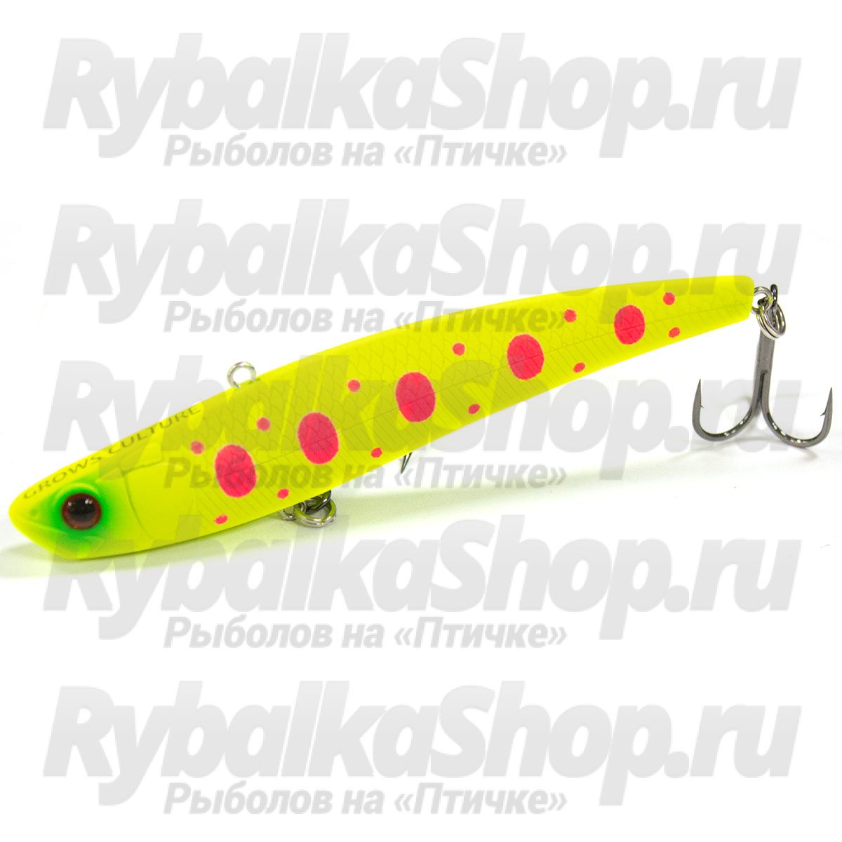 Grows Culture Day Ruf 90mm 24g - это воблер семейства VIB (vibrations). ВИБы прогонистой формы с большим удельным весом рыболовы используют, как правило, при ловле взаброс на глубоких местах или на сильном течении. В таких условиях данный тип приманок действительно очень эффективен и уловист. Но российские рыболовы давно обратили внимание на результативность безлопастных тонущих воблеров семейства VIB для ловли в отвес из подо льда.