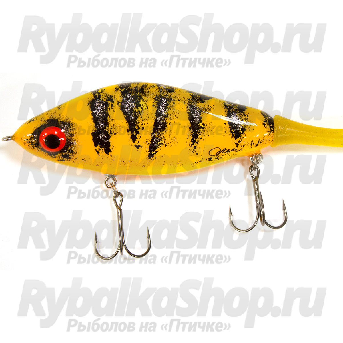Изготавливается в трех размерах: 90 мм, 110 мм и 135 мм. Вес приманок 45 гр. +/- 5 граммов, 60 гр. +/- 5 граммов и 115 гр. +/- 5 гр. соответственно. Эта приманка является одной из самых популярных среди любителей трофейной рыбалки на щуку. Отлично скользит по воде из стороны в сторону с покачиваниями боками, что провоцирует хищника на атаку. Глубина использования может быть от 0 до 5 метров.