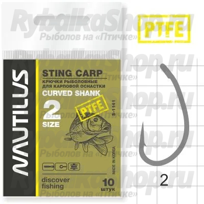 Крючок Nautilus Sting Carp Curved Shank S-1141 Эффективные стальные карповые крючки в плане засечки, т.к. за счет изогнутого цевья легко проворачиваются в пасти рыбы и не требуют применения термоусадочной трубки. Хорошо сочетаются с короткими поводками из мягких материалов. Крючки обладают специальным покрытием PTFE, которое поглощает солнечный свет и ликвидирует паразитные блики.