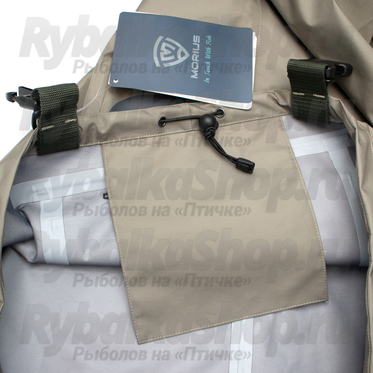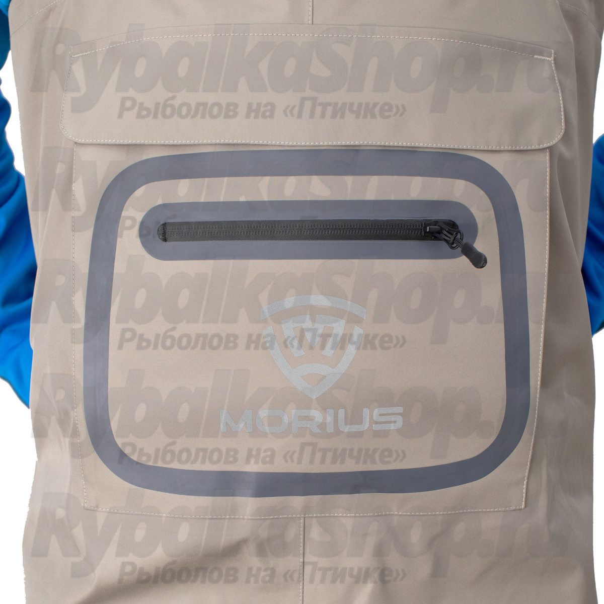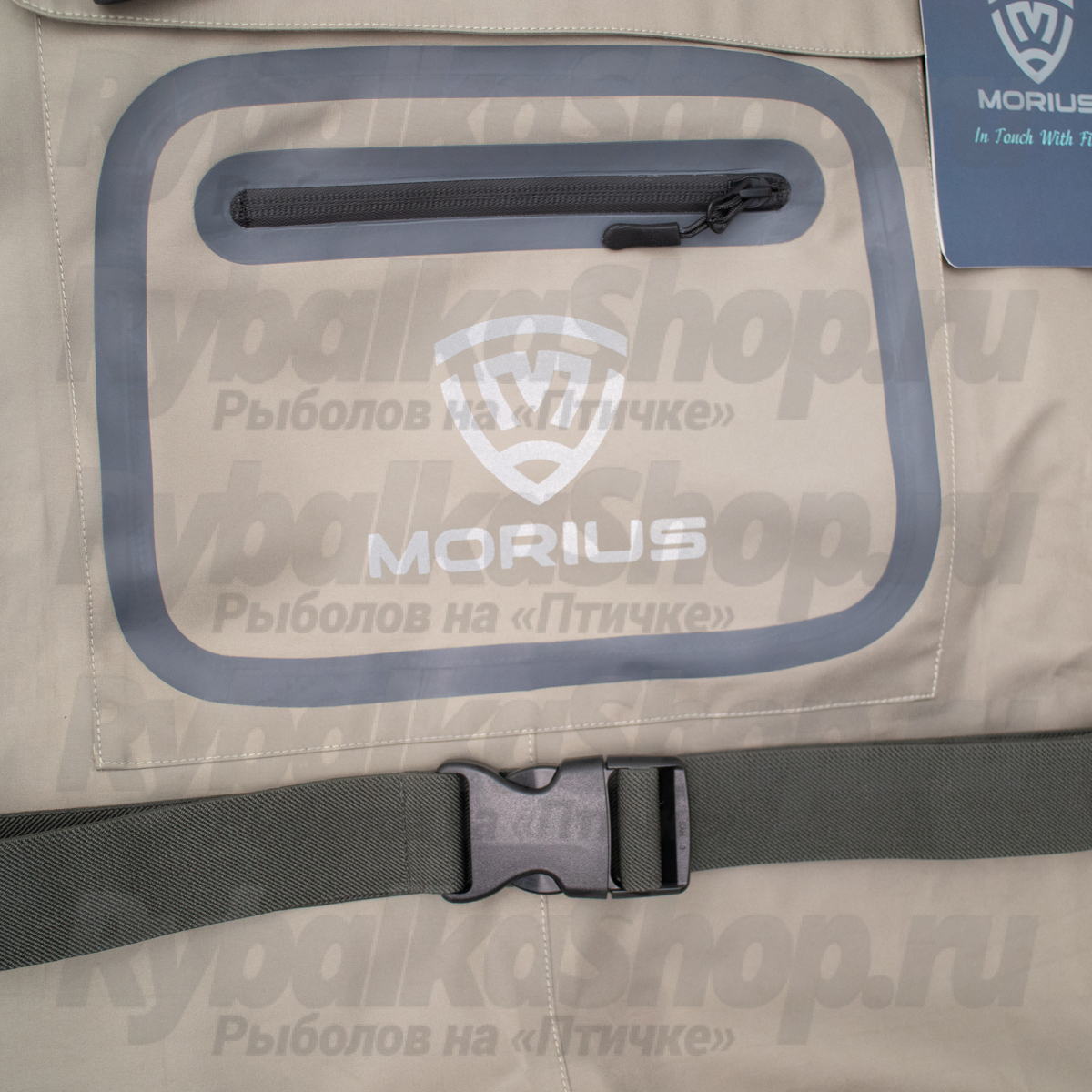Вейдерсы Morius WadeMaster выполнены из трёхслойной водонепроницаемой дышащей ткани. Швы усилены двухслойной армирующей лентой, которая устойчива к износу и разрыву, а на коленях сделано четырёхслойное усиление. Носок вейдерсов выполнен из 4-миллиметрового сухого неопрена с двойной лентой и защитной гардой, а также с противоскользящей технологией на стопе. Поясной ремень и подтяжки Х-образной формы легко регулируются, имеют удобную застёжку системы фастекс и не мешают движениям. D-образные кольца дают возможность закрепить инструменты или подвесить за них вейдерсы во время сушки. Есть просторный водонепроницаемый карман на груди.