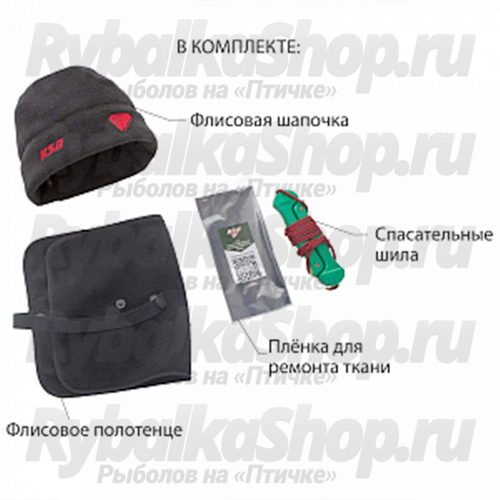комплектуется флисовой шапкой, спасалками, флисовым полотенцем с креплением на ногу, салфеткой для оптики (в левом нагрудном кармане);