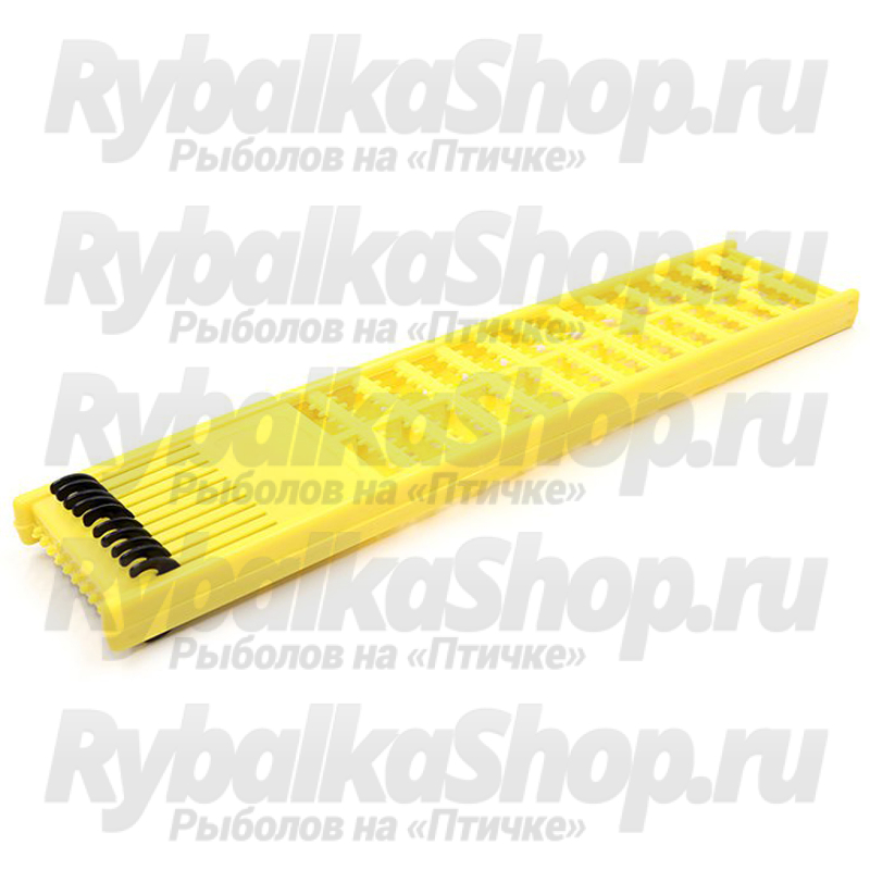 С каждой стороны поводочницы присутствует по 10 черных выступов, за которые цепляется крючок и леска натягивается вокруг поводочницы.