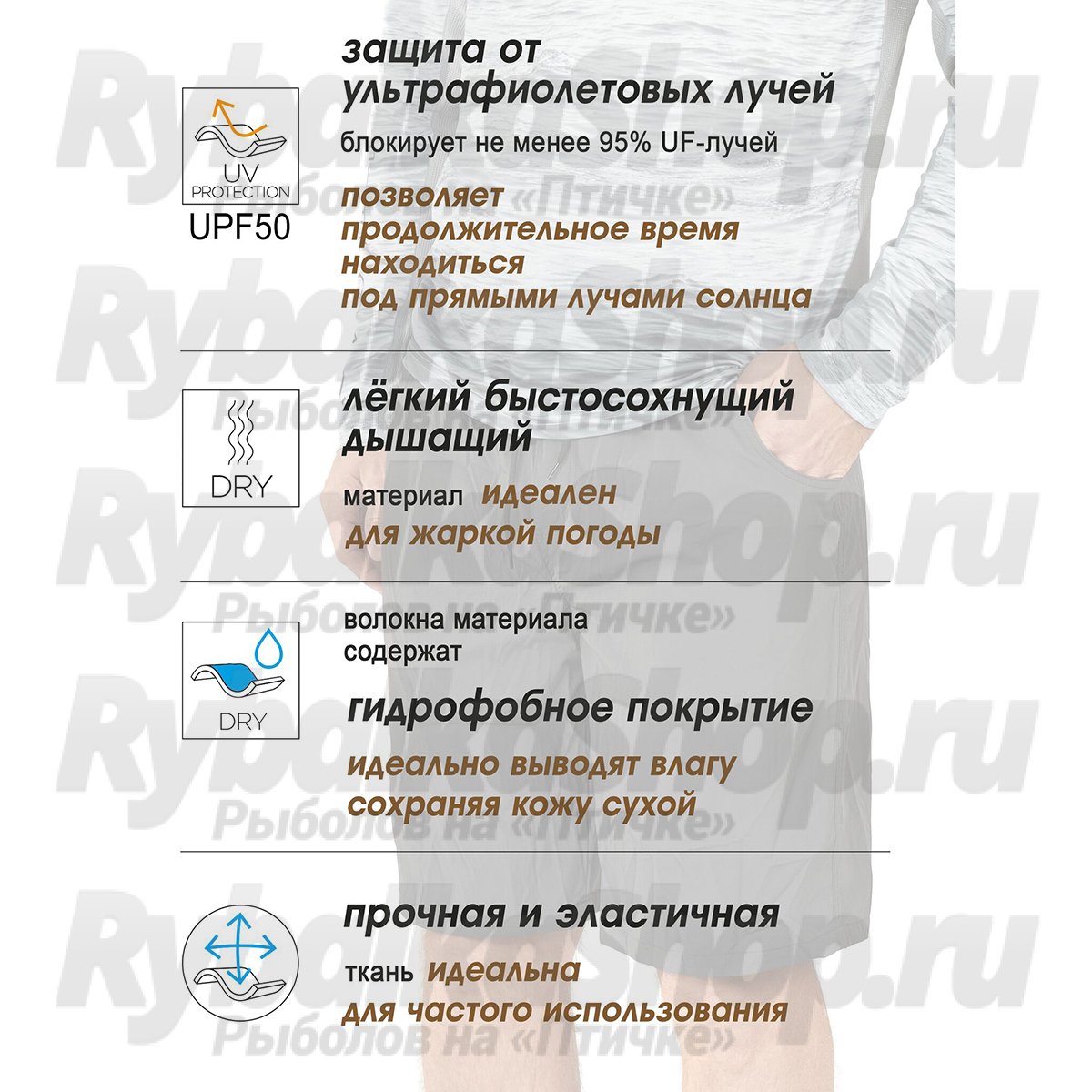 - Ткань с защитой от ультрафиолетовых лучей. UPF 50+. Блокирует не менее 95% UF-лучей, даже во влажном состоянии.