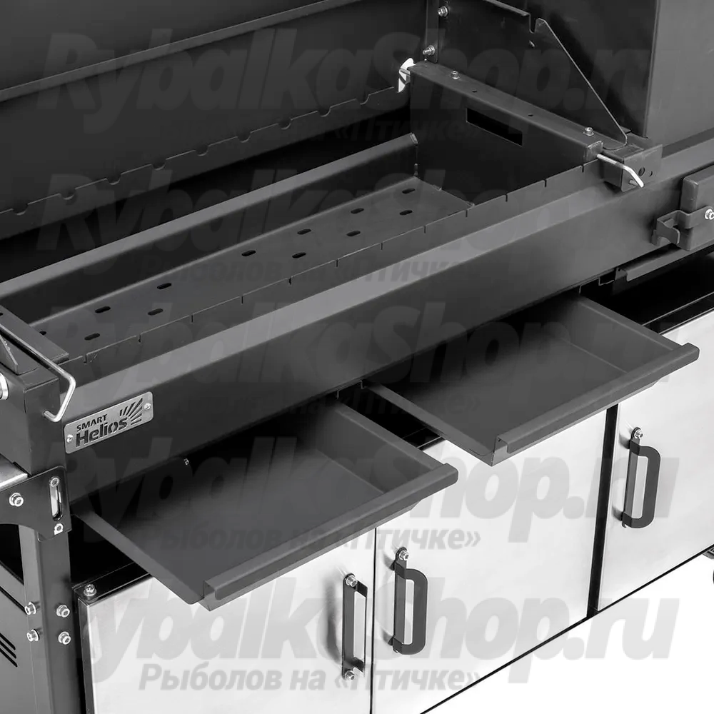 Мангал Helios SMART-1200 Ультра - это функциональный мангал с расширенным набором опций, предназначенный для приготовления различных блюд на открытом воздухе. Большая жаровня, крышка-гриль и угольный лифт, обеспечивающие жар необходимой интенсивности, печь под казан - все эти функции позволят Вам в полной мере оценить преимущества данного гриля, и Вы получите удовольствие как от превосходно приготовленных блюд, так и от самого процесса их приготовления.Данная модель обладает всеми возможностями, необходимыми как начинающему, так и продвинутому мастеру по грилю, и безусловно удивит Вас сочетанием функциональности, гармоничного дизайна и безупречного качества.Мангал оснащен всем необходимым для комфортного приготовления блюд на открытом огне: жаровней с перфорированным дном, крышкой-гриль, угольным лифтом, 2-мя решетками-гриль из пищевой нержавеющей стали, датчиком температуры, 3-мя съемными зольниками, 2-мя боковыми столиками (с подстаканниками и без), удобным шкафом с 3-мя дверками из нержавеющей стали для хранения посуды и утвари, держателями инструментов, усиленными поворотными колесами с тормозом и боковой ручкой для удобства перемещения мангала.Также в комплектацию входит подставка под казан с конфоркой для приготовления разнообразных блюд.Жаровня мангала, печь под казан, угольный лифт, зольники окрашены термостойкой краской, которая выдерживает нагрев до 1000°С. Фигурные вырезы в стенках жаровни (по краю) дают возможность регулировать положение шампуров. В жаровне предусмотрены отверстия в днище, которые обеспечивают доступ воздуха к углям, что значительно облегчает их розжиг и способствует их быстрому разгоранию. На продольных стенках жаровни выполнены ребра жесткости, которые практически исключают деформацию мангала при нагреве.На боковых стенках крышки-гриль имеются пазы под вертел (* доп.опция).Угольный лифт с регулировкой в нескольких положениях по высоте позволяет выбрать оптимальное расстояние от угля до зажариваемого продукта, в результате чего обжарка продуктов получается равномерной.Дымоход состоит из трех модулей трубы и оголовка-зонтика и обеспечивает полный и качественный отвод продуктосв горения и гарантирует пожаробезопасность мангала.Чехол из изностостойкого материала Оксфорд для защиты мангала от пыли, грязи, осадков в подарок!