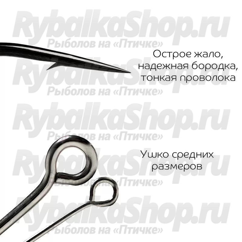 Ушко крючка средних размеров, оно увеличено до такой степени, чтобы не подклинивать на чебурашках с разной по толщине проволокой, при этом не сильно большое и не теряется общая компактность крючка. Особенно это ощущается на крючках в размерах 12 и 14, они просто идеальны для “нано”.