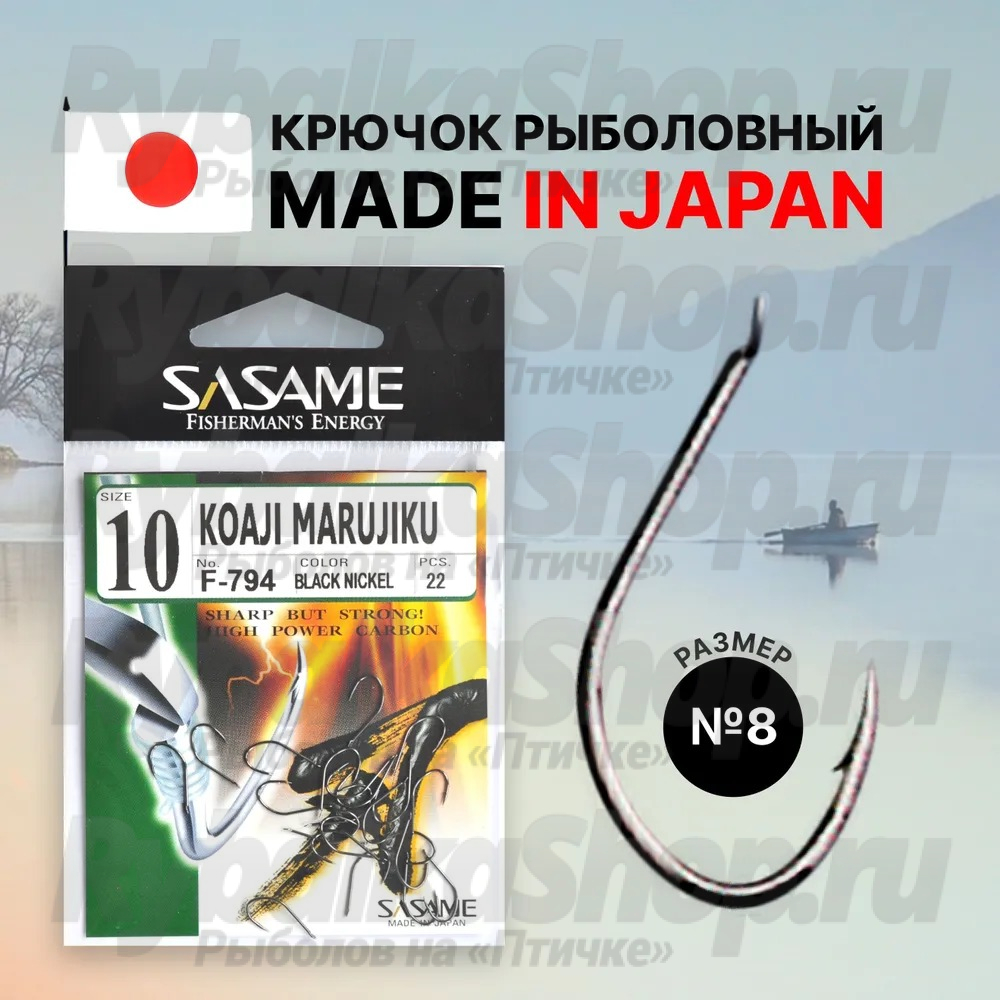 Sasame Koaji Marujiku F- 794 - рыболовный крючок сложной обтекаемой формы, которая показывает отличную реализацию поклевок при ловле на течении. Крючок имеет цевье средней длины, средний по вылету поддев, острое жало загнуто внутрь. При ловле на течении, насадка смещается в углубление крючка – при этом не закрывая жало.