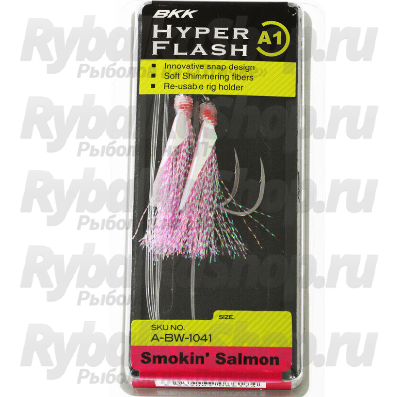 Серия Hyper Flash A1 belo оснащена крючками BKK Octopus Beak, покрытыми черным никелем. Каждый крючок имеет мерцающие волокна, чтобы улучшить презентабельность оснастки, и поставляется в четырех различных цветовых сочетаниях: желтый хирург (шартрез), копченый лосось (розовый), красный клык (красно-оранжевый), летучая рыба (сине-серебристый). Доступны в леске 60 фунтов (3 крючка) и 80 фунтов (2 крючка).