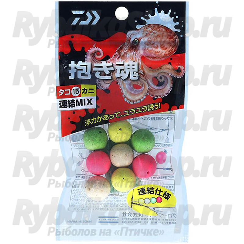 Плавучесть - решающий фактор! Очень привлекательный для осьминога, покачивающегося в воде шарик Daiwa Dakitama Tako 15 (диаметр 15 мм). По вкусу напоминает краба, который является излюбленным лакомством для осминога.