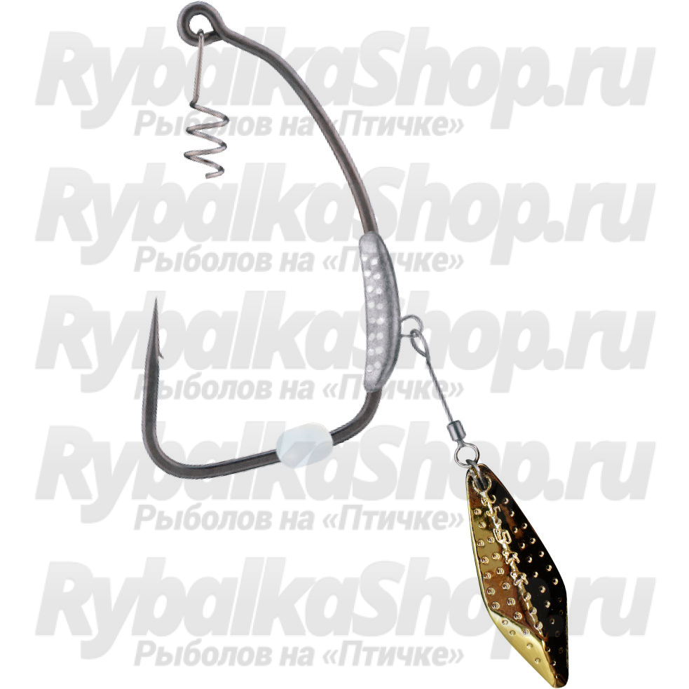 Геометрия крючка разработана специально для оснащения крупных приманок и надежного удержания мощной рыбы после подсечки. Несмотря на большую толщину крючка, его жало благодаря алмазной заточке крайне острое и уверенно пробивает крепкие пасти щуки и судака. Для более удобного оснащения и минимизации повреждений приманки крючок имеет вкручивающуюся пружину, которая надежно удерживает силикон. Чтобы приманка не съезжала вниз по поддеву и не оголяла жало раньше времени, на крючке предусмотрен регулируемый резиновый фиксатор.