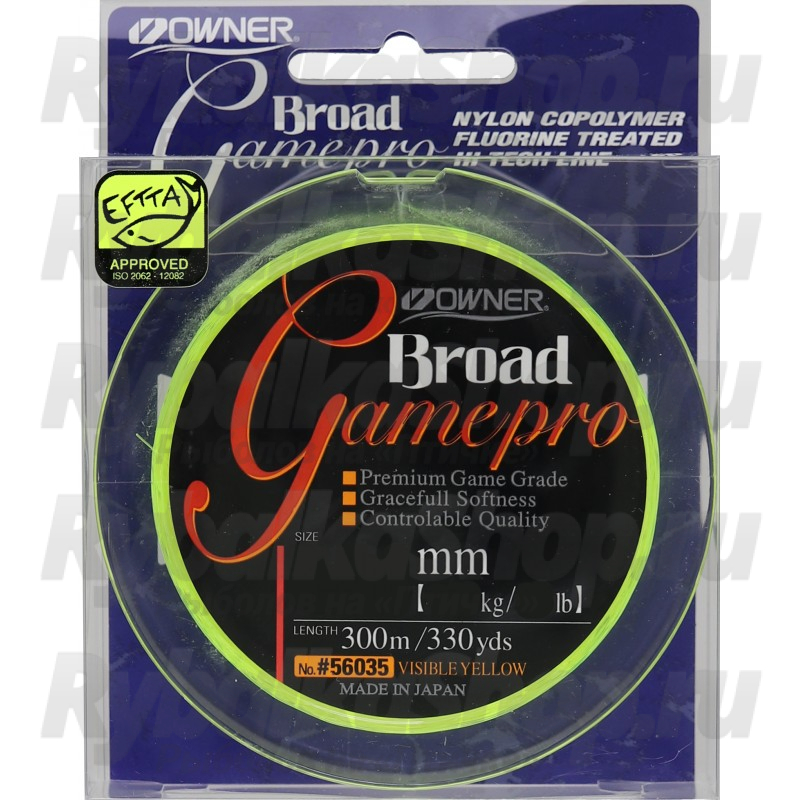 Монофильная леска Owner Broad Game Pro - прекрасный образец высшего качества, одобренного Торговой Ассоциацией Европейских Рыболовов. Эта леска с четко откалиброванными диаметрами и честными разрывными характеристиками прослужит долго, так как при изготовлении применялись материалы, выдерживающих перепады температур и снижающих воздействие ультрафиолетовых лучей. Леска Owner Broad Game Pro используется многими рыболовами и имеет хорошую репутацию среди знатоков качественных рыболовных товаров.