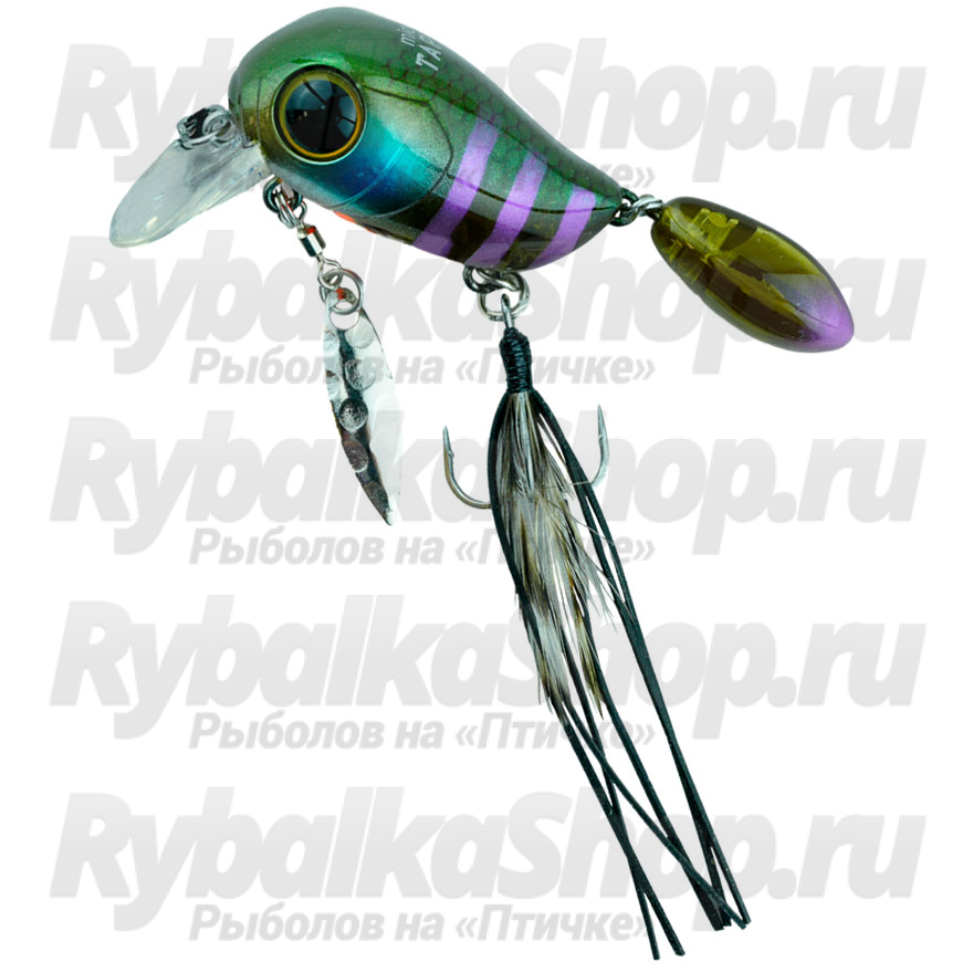 Важной особенностью Jackall Micro Tappy является оперение на тройном крючке, а также подвижные элементы в виде двух вращающихся лепестков на брюшке и хвостовой части воблера. На равномерной проводке они играют синхронно с приманкой, увеличивая частоту и интенсивность колебаний, что позволяет привлечь внимание окуня и белых хищников в теплой воде.