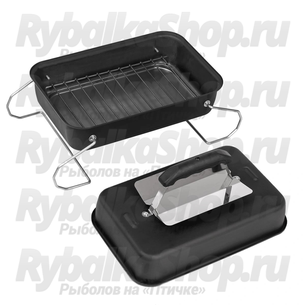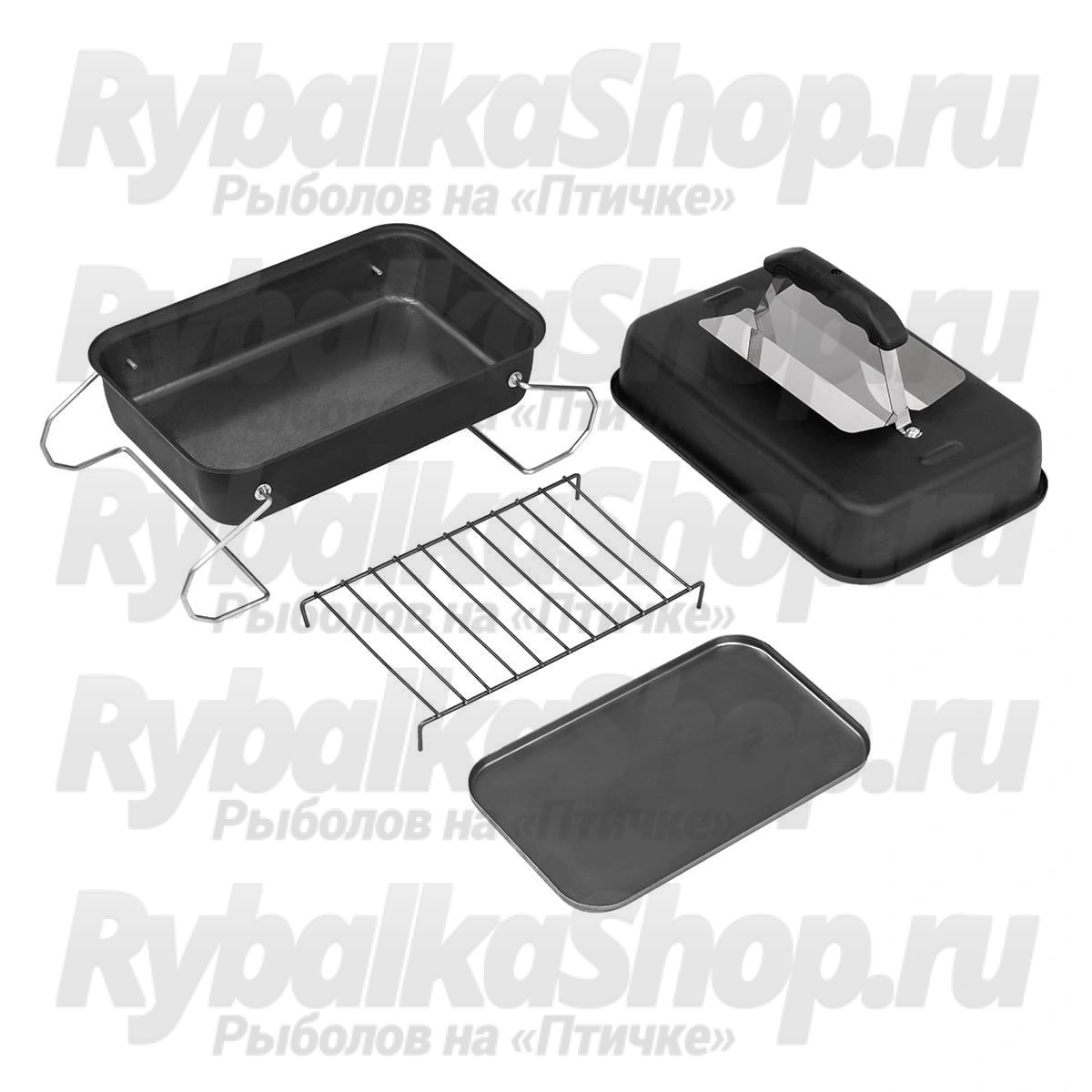 В комплект коптильни входит: корпус, удобная крышка с ручкой и отражателем, решетка для размещения продуктов и поддон для сбора жира.