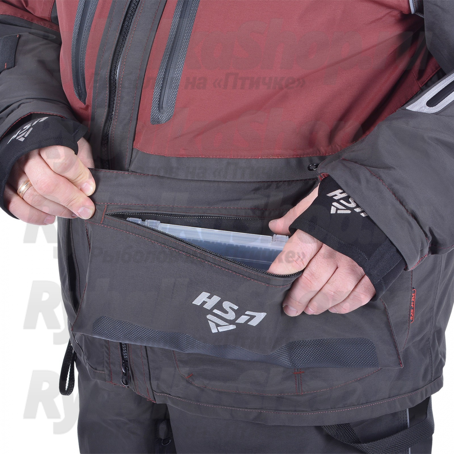 Высокий воротник куртки надёжно защищает от ветра, а удобный капюшон с жёстким козырьком эффективно противостоит ветру и влаге. Глубокие утепленные карманы предназначены для хранения необходимого инвентаря и согрева рук. Дополнительный съёмный карман с пластиковой коробкой для приманок (размером 22*12*2 см) крепится на молнии.