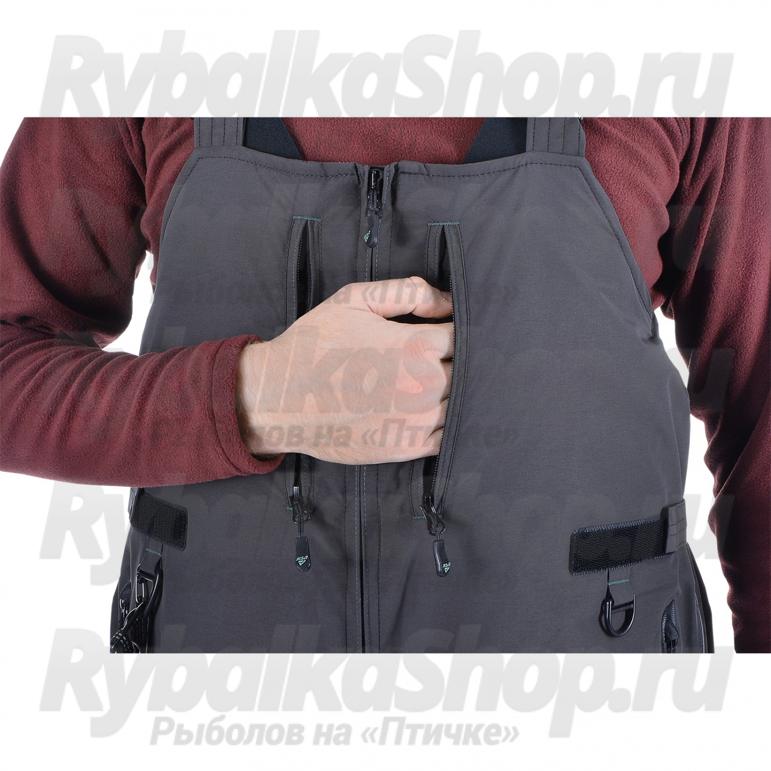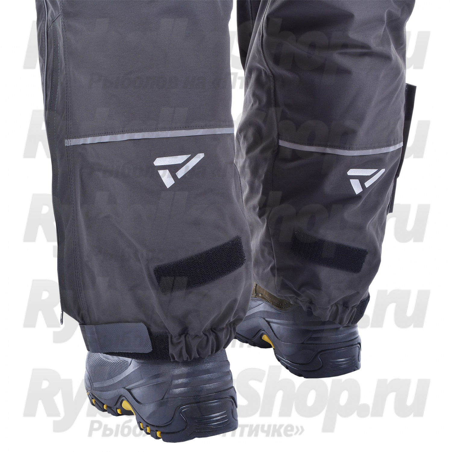 На высоком теплом полукомбинезоне в наколеннике есть специальные съемные вставки из ППЭ. Наколенник усилен дополнительно прочной термоустойчивой пленкой Protectfilm австрийского производства. Низ полукомбинезона имеет перфорацию на ткани для быстрого вытекания воды.