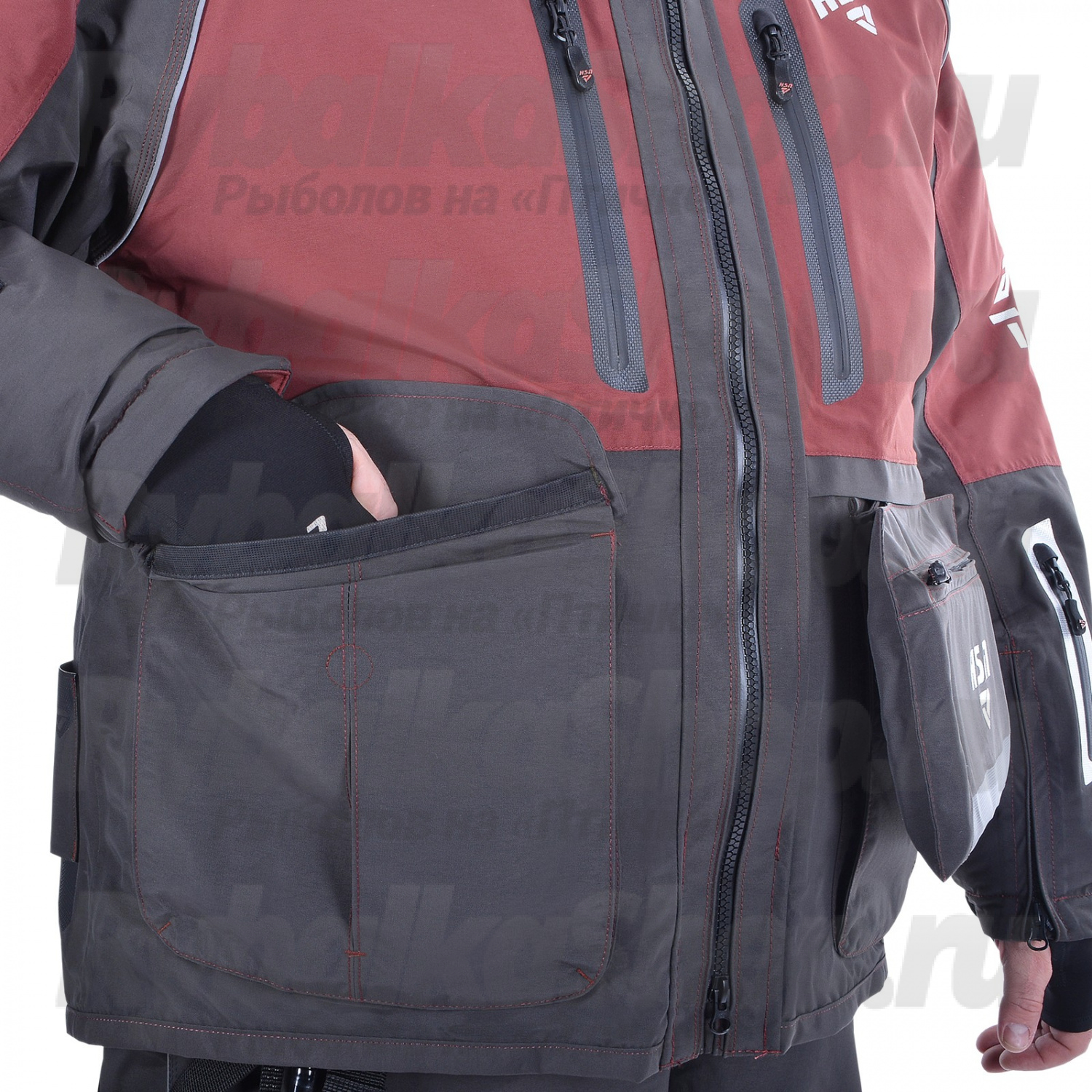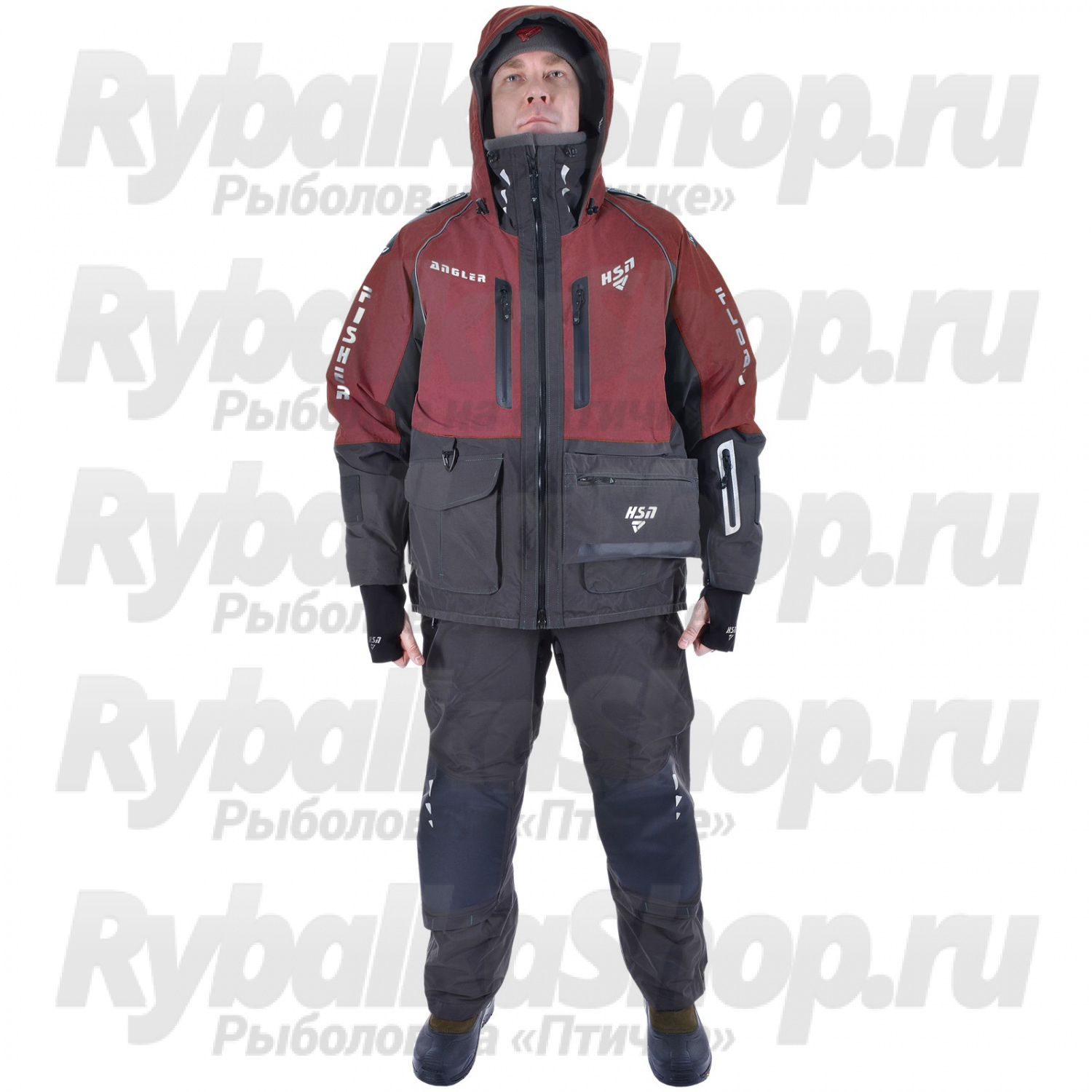 Высокий воротник куртки надёжно защищает от ветра, а удобный капюшон с жёстким козырьком эффективно противостоит ветру и влаге. Глубокие утепленные карманы предназначены для хранения необходимого инвентаря и согрева рук. Дополнительный съёмный карман с пластиковой коробкой для приманок (размером 22*12*2 см) крепится на молнии.