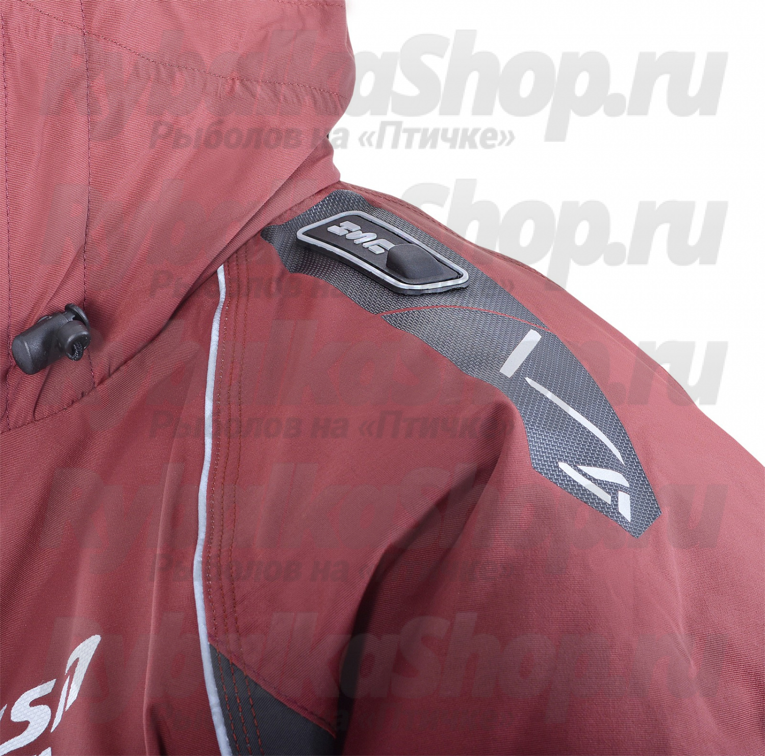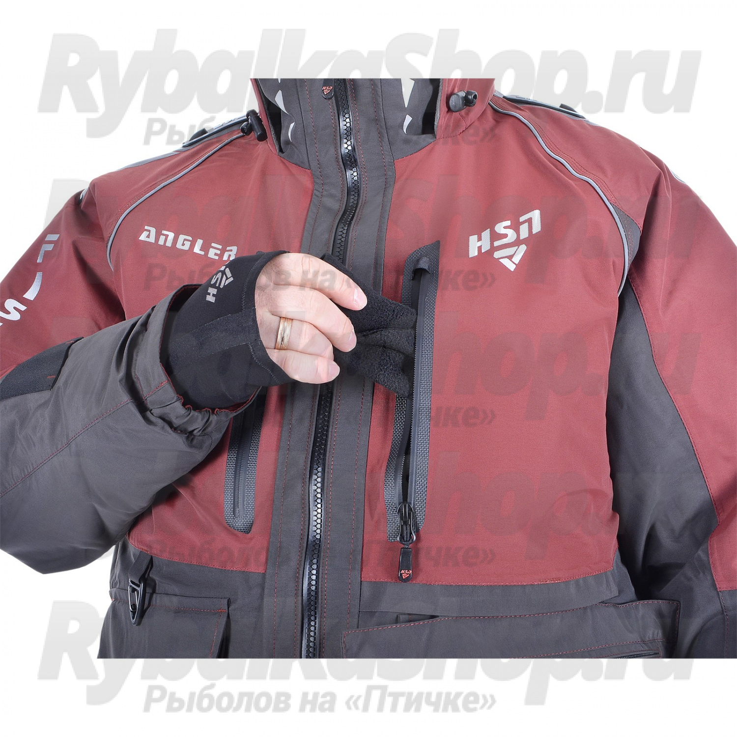 Высокий воротник куртки надёжно защищает от ветра, а удобный капюшон с жёстким козырьком эффективно противостоит ветру и влаге. Глубокие утепленные карманы предназначены для хранения необходимого инвентаря и согрева рук. Дополнительный съёмный карман с пластиковой коробкой для приманок (размером 22*12*2 см) крепится на молнии.