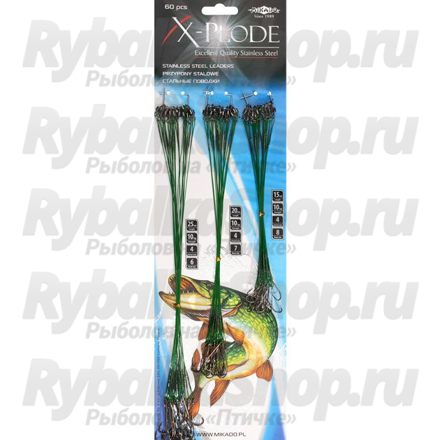 Поводки Mikado X-Plode - это широкая линейка различных моделей, изготовленных из переплетенных между собой тросов из стали, вольфрама или титана. Предложение включает как основные аксессуары – поводки с вертлюжком и застежкой для самостоятельного крепления, так и специальные поводки, оснащенные крючками или якорями. Доступные в версиях разной длины и устойчивости к разрыву, предлагаются в упаковках по две штуки и в наборах по 30/60/75 штук.