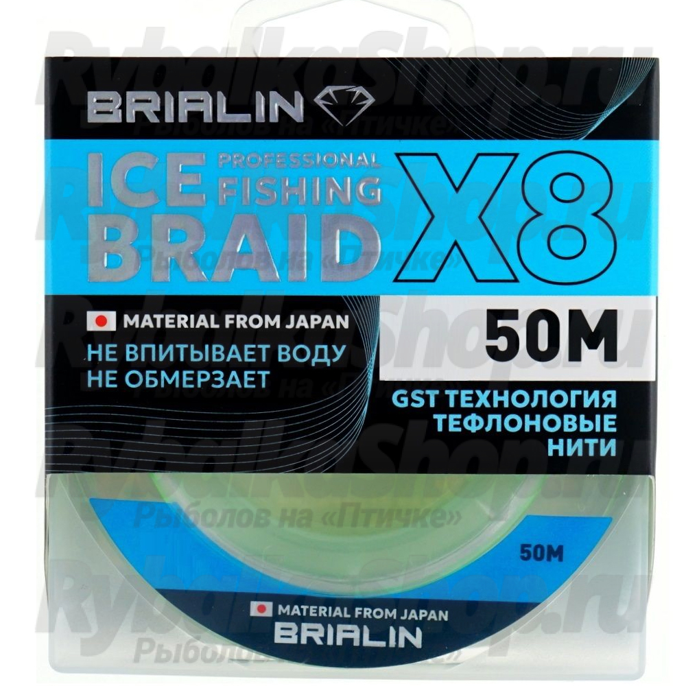 Зимний плетеный шнур 8Х от Brialin из тефлоновых нитей не пьёт воду и не обмерзает, а это значит, вам не придётся его обрабатывать силиконом или маслом.