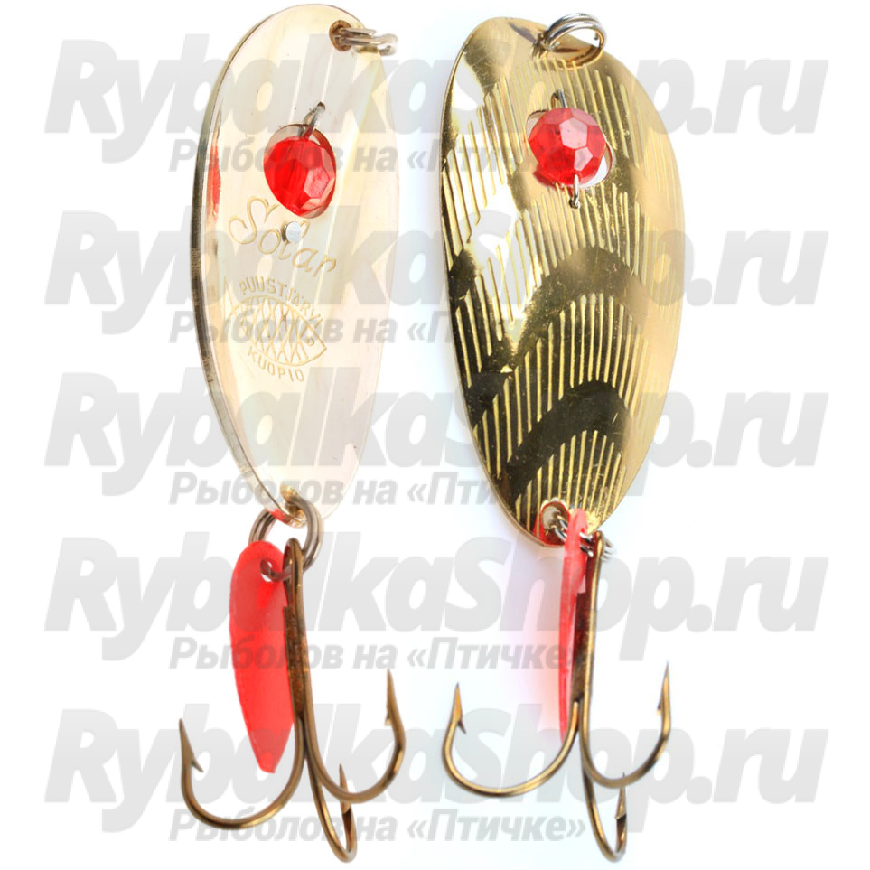 Блесна Puustjarven SOLAR имеет достаточно интересную форму, при небольшой длине оно достаточно широкое, что делает игру приманки более размашистой и позволяет во время проводки использовать продолжительные паузы. Тело приманки не только окрашено, но и ребристое, крючки оснащаются красным хвостиком.