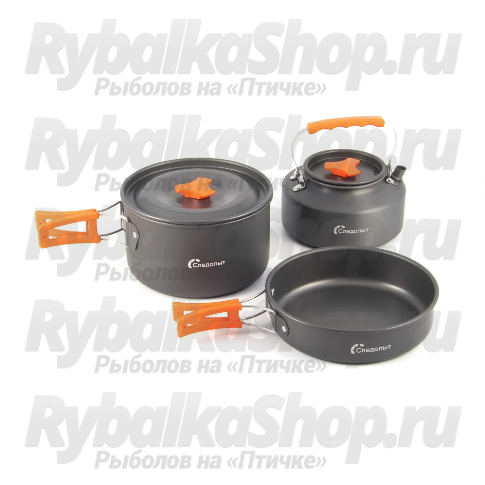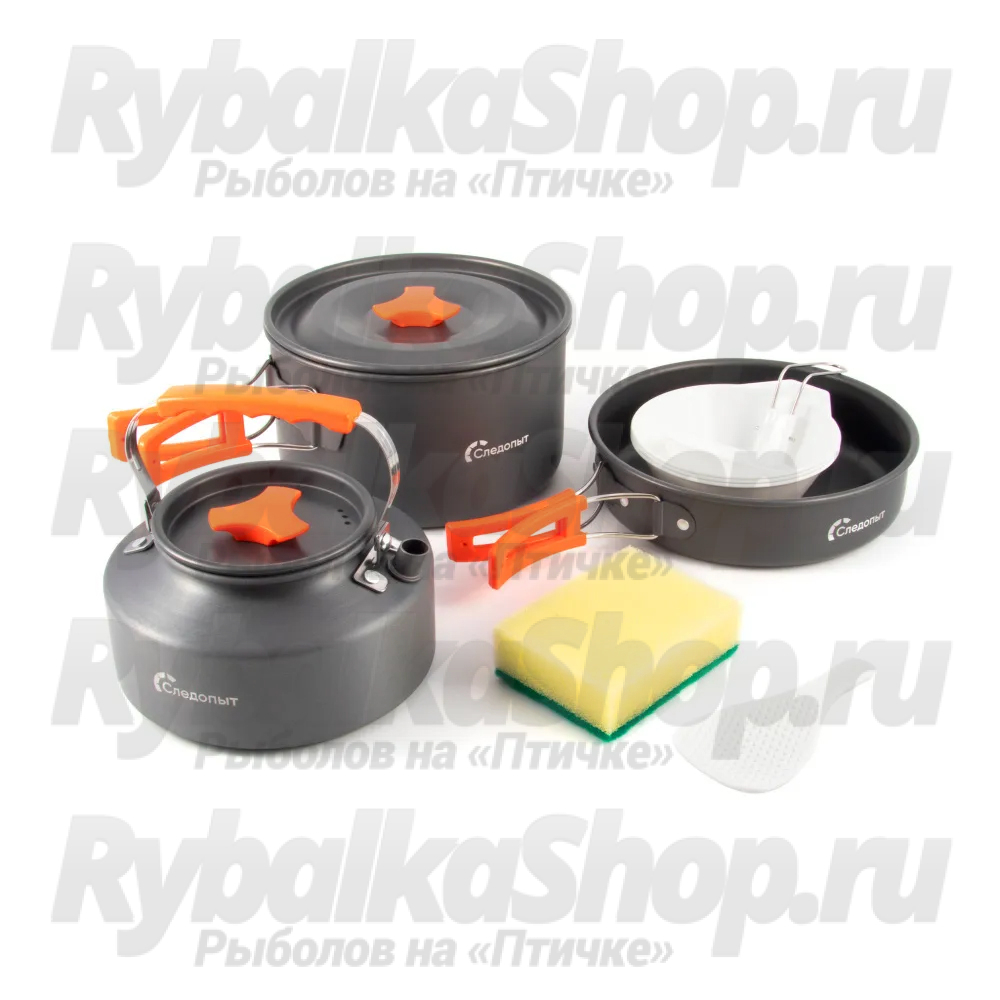 Набор кемпинговой посуды СЛЕДОПЫТ - Optimum изготовлен из анодированного алюминия, имеет усиленное плоское дно. Обладает высокой прочностью и сопротивляемостью к коррозии, что обеспечивает долгий срок эксплуатации. Предназначен для кипячения и подогрева воды, заваривания чая или приготовления различных напитков (отваров, компотов и т. п.) для небольшой группы людей во время загородных путешествий, на рыбалке, охоте или в кемпинге. Набор имеет компактный размер и очень легкий вес. Рассчитан на 2-3 персоны.