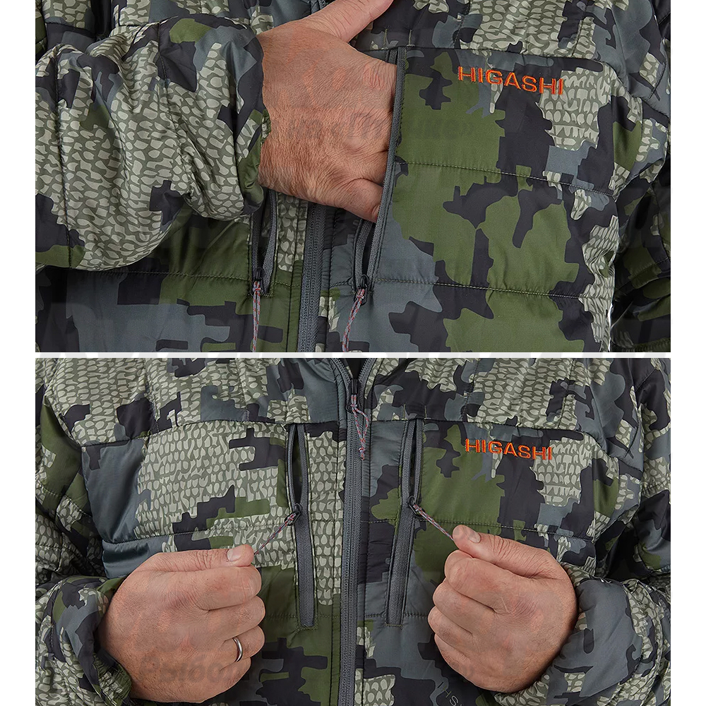 Легкая и теплая куртка HIGASHI TIMBER JACKET подходит к разным погодным условиям и разным уровням физической активности. Она может использоваться, как верхняя одежда в осенне- весенней период, так и как дополнительный утепляющий слой под верхней одеждой в холодный и очень холодный зимний период. Полнофункциональный капюшон обеспечивает защиту от непогоды, а многочисленные карманы позволят расположить в них все необходимое снаряжение. В производстве изделия используется высокоэффективный синтетический утеплитель, который не впитывает влагу и внешняя ткань с водоотталкивающей пропиткой. Благодаря этому куртка хорошо дышит и отводит испарения во время высоко физической активности, быстро сохнет если намокнет. Куртка имеет небольшой вес и минимальный объем в сложенном состоянии, ее можно компактно разместить в рюкзаке в качестве подстраховки во время рыбалки или охоты в изменяющихся погодных условиях.