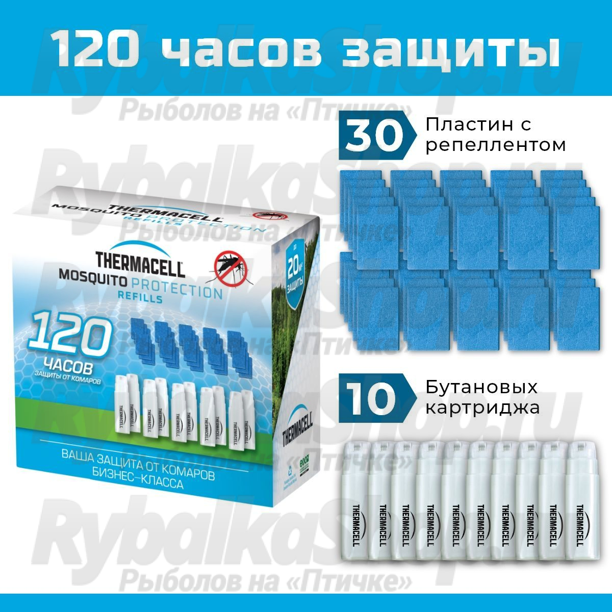 Набор запасной Thermacell Mega Refill (10 газовых картриджей + 30 пластин) для приборов Thermacell порадует тех, кто любит покупать больше, а платить меньше. Это самый экономичный набор по соотношению цены и количества часов защиты.