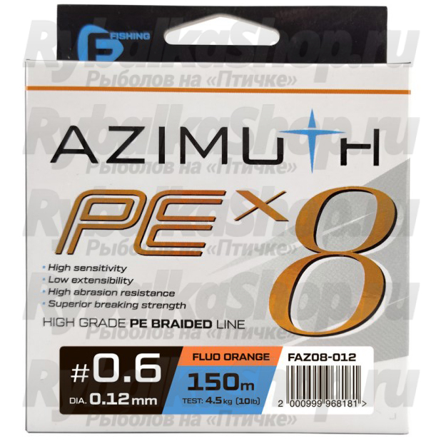 F-Fishing Azimuth BRAID PE X8 - высококачественный рыболовный шнур изготовлен с использованием современного PE материала при участии рыболовов-спортсменов. предназначен для ловли спиннингом. Благодаря плотному круглому плетению, быстро тонет и обладает минимальной парусностью на течении и ветре.