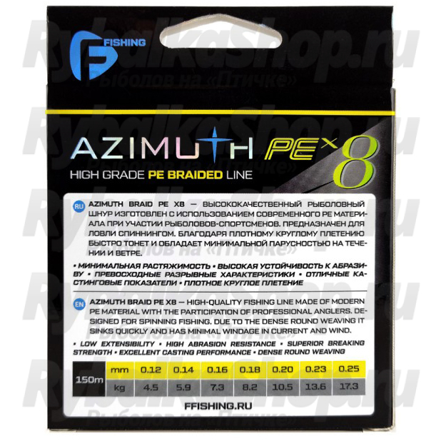 F-Fishing Azimuth PE X8 - высококачественный рыболовный шнур изготовлен с использованием современного PE материала при участии рыболовов-спортсменов. предназначен для ловли спиннингом. Благодаря плотному круглому плетению, быстро тонет и обладает минимальной парусностью на течении и ветре.