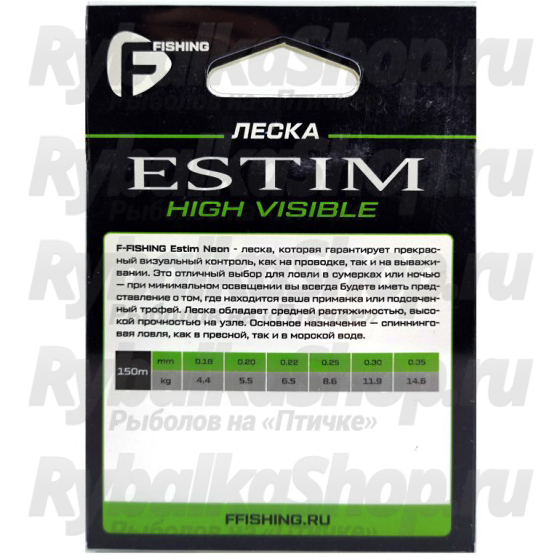F-FISHING Estim Neon - леска, которая гарантирует прекрасный визуальный контроль, как на проводке, так и на вываживании. Это отличный выбор для ловли в сумерках или ночью — при минимальном освещении вы всегда будете иметь представление о том, где находится ваша приманка или подсеченный трофей. Леска обладает средней растяжимостью, высокой прочностью на узле. Основное назначение — спиннинговая ловля, как в пресной, так и в морской воде.