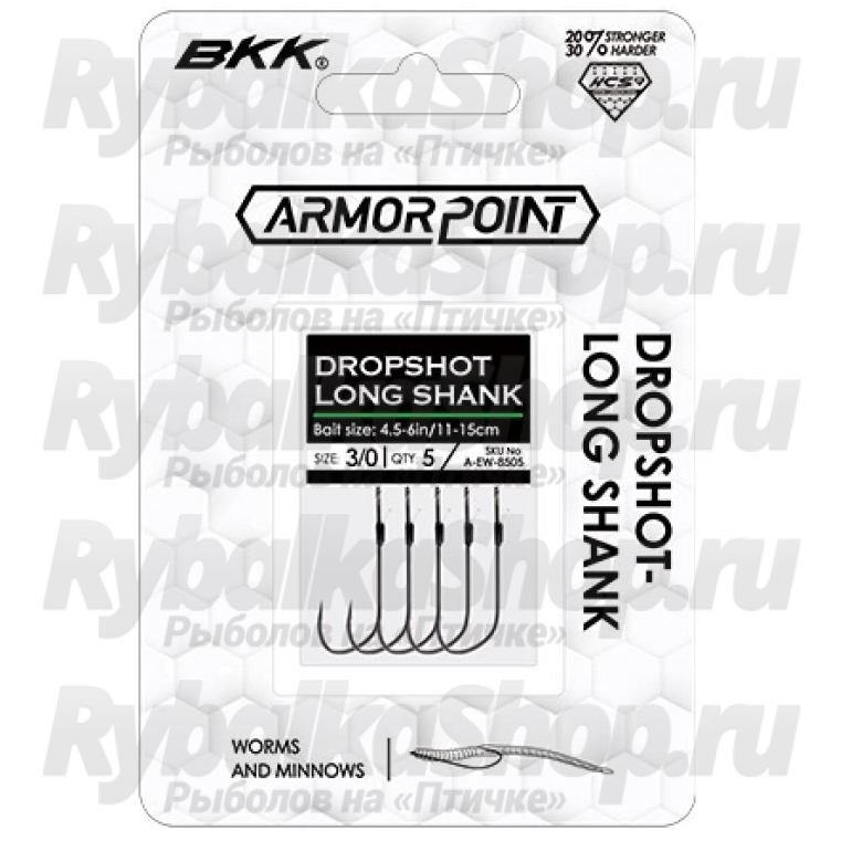 Одинарный крючок BKK Dropshot – Long Shank имеет удлиненное цевье и предназначен для работы с силиконовыми приманками, обладающими длинным телом. Он позволяет червям и пиявкам демонстрировать игру, способную привлекать как активного, так и пассивного хищника. Ограничитель, находящийся в верхней части цевья, не дает приманке сползать на леску, чем продлевает ей жизнь.