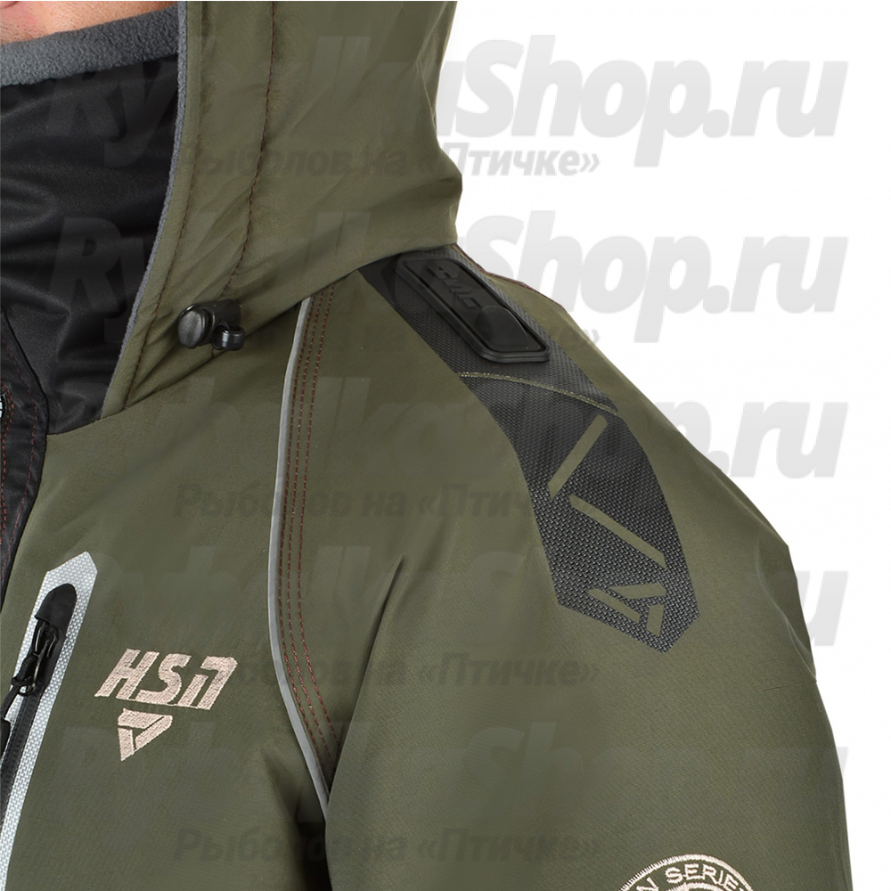 Куртка оснащена высоким воротником для защиты от ветра и глубоким капюшоном с жестким ветрозащитным козырьком. Утепленные карманы на куртке предназначены для размещения необходимого снаряжения и согрева рук. Специальные крепления для спасалок (идут в комплекте) и перфорация ткани на спинке и рукавах облегчают выход из воды при случайном падении.