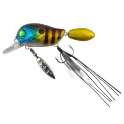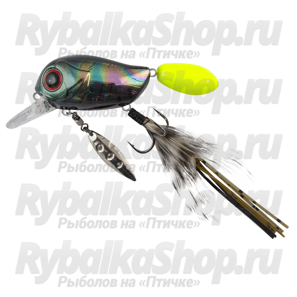 Особенности дизайна: KIKI MR 54F не похож на остальные воблеры-кренки, поскольку имеет в своей конструкции ряд оригинальных дополнительных элементов, призванных привлечь внимание хищной рыбы. Под брюшком у приманки находится подвижный металлический лепесток, который вращается при проводке, в задней части – жесткий пластиковый хвостик, который при движении в воде колеблется из стороны в сторону, а единственный тройник воблера оснащён мушкой из перьев и довольно длинных силиконовых нитей. Головная часть KIKI MR 54F рельефно имитирует жаберные крышки, а вклеенные объемные 3D глаза завершают реалистичный дизайн приманки.
