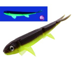 Приманка с округлой в сечении передней частью, рельефной «чешуйчатой» поверхностью и подвижным V-образным хвостиком. Благодаря своей геометрии, обладает очень важной полетной характеристикой: даже с минимальной огрузкой при забросе он устойчив к боковым порывам ветра, летит точно в самых разных условиях.