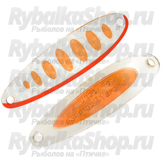 Pontoon21 Sinuoso Spoon - узкотелые колеблющиеся блесна с изогнутым профилем в хвостовой части с двусторонним рисунком и рифленой поверхностью. Внешняя сторона приманки, выполненная в виде рельефной поверхности с нанесенным на нее рисунком, способствует дополнительному привлечению хищника.