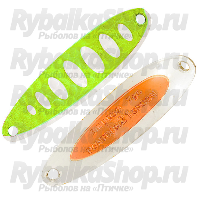 Pontoon21 Sinuoso Spoon - узкотелые колеблющиеся блесна с изогнутым профилем в хвостовой части с двусторонним рисунком и рифленой поверхностью. Внешняя сторона приманки, выполненная в виде рельефной поверхности с нанесенным на нее рисунком, способствует дополнительному привлечению хищника.