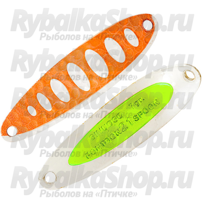 Pontoon21 Sinuoso Spoon - узкотелые колеблющиеся блесна с изогнутым профилем в хвостовой части с двусторонним рисунком и рифленой поверхностью. Внешняя сторона приманки, выполненная в виде рельефной поверхности с нанесенным на нее рисунком, способствует дополнительному привлечению хищника.