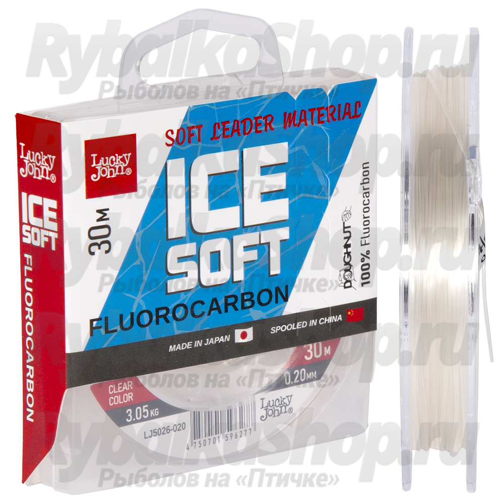 Специальная мягкая леска Lucky John Ice Soft Fluorocarbon 30m из флюорокарбона для ловли крупной, сильной рыбы из-подо льда. Может использоваться как в качестве основной лески (более тонкие диаметры), так и в качестве поводков и шок-лидеров.